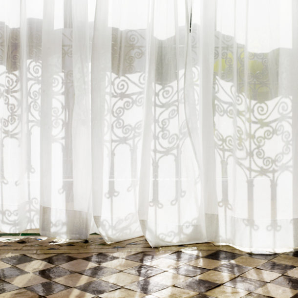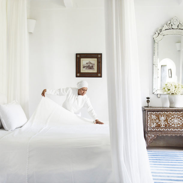 La restauration du bâtiment a été réalisée par des artisans locaux, avec des matériaux traditionnels. Une atmosphère de luxe décontracté et intemporel s’en dégage, tandis que les voilages blancs habillent les terrasses pour apporter plus d’intimité aux suites très spacieuses. Des murs simplement blanchis à la chaux, des plafonds zouak, des couleurs chaudes, douces et reposantes et un décor sobre créent une ambiance détendue, charmante et sereine.