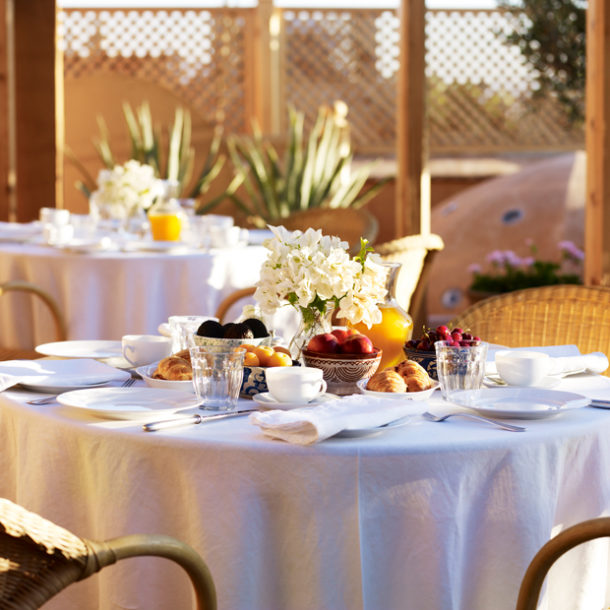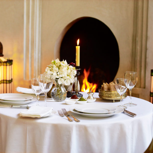 Le soir, le dîner est servi dans la salle à manger. Lorsque les soirées sont fraîches, les rideaux sont tirés et on allume un feu de bois avant de servir les plats marocains traditionnels. Lorsque les températures sont plus clémentes, les portes vitrées s’ouvrent largement sur le jardin intérieur pour laisser entrer le murmure de la fontaine et les parfums capiteux du jardin.