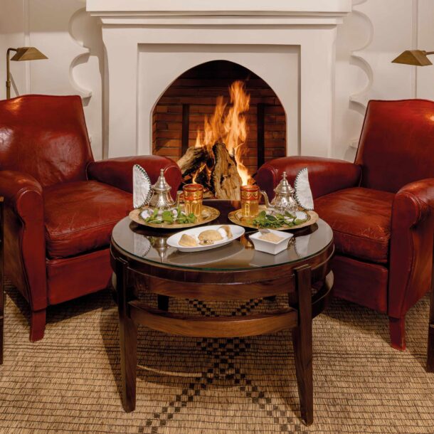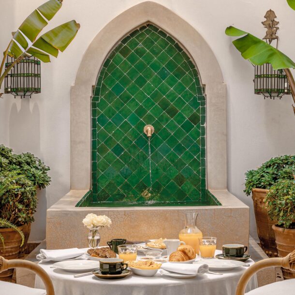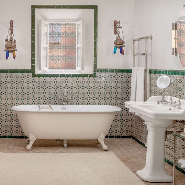 Plus grande suite du riad, la suite Agadir s’ouvre, par des portes vitrées du sol au plafond, sur une cour privée agrémentée d’une fontaine de carrelage vert de Fès. Le cadre idéal pour prendre le petit-déjeuner, le déjeuner et les dîners aux chandelles. Avec ses hauts plafonds et son agencement ouvert, la suite est lumineuse et aérée avec le confort supplémentaire d’un feu ouvert. Un lit Empereur habillé de coton égyptien fin et de cachemire repose sur un tapis mauritanien en roseau et en cuir et est flanqué de bols d’essai du début du XIXe siècle pour le sud du Maroc. Un dressing jouxte la chambre qui mène à son tour à une spacieuse salle de bains carrelée avec douche et baignoire.