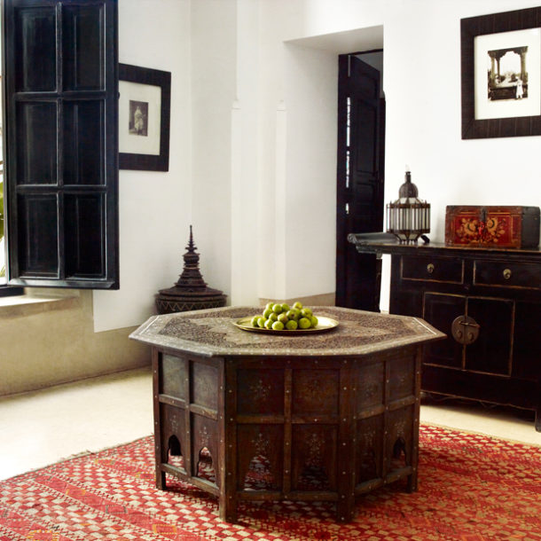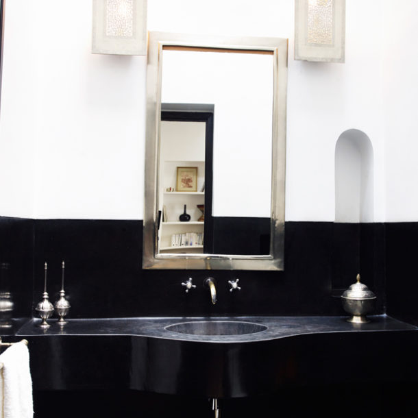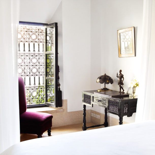 La Suite Asilah située au premier étage est une enfilade de pièces. Le salon agrémenté d’une cheminée est adjacent à une salle de bains en tadelakt et plâtre peint. La suite est particulièrement lumineuse grâce à ses larges baies et sa large puits de lumière . La chambre, avec son lit king size à baldaquin, sa grande armoire et son bureau, donne sur le jardin intérieur et la piscine.